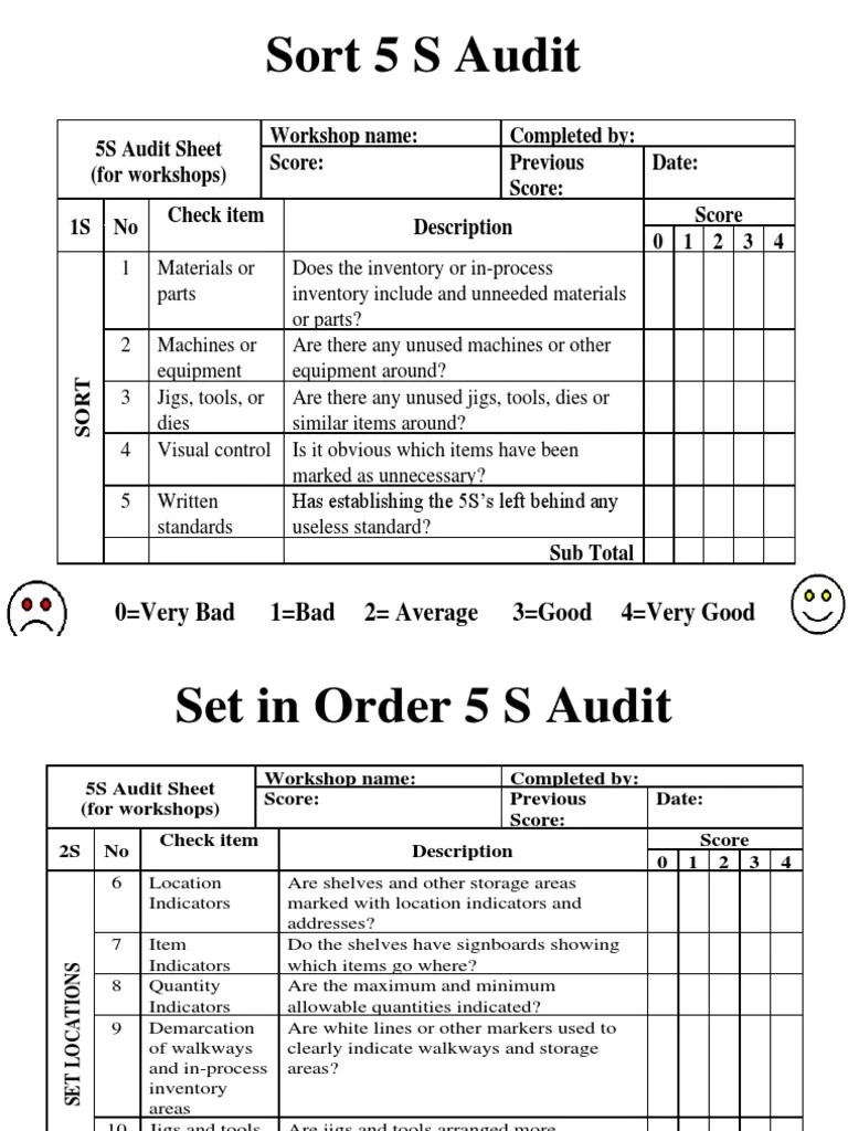 One of the most important part of a sustainable 5s culture is the 5s mini audit (panneman, 2019). With this template, you can easily conduct a 5s audit and track the resulting trends and actions needed for improvement. Download free excel templates for 5s audits in manufacturing and office settings. Download a free 5s audit spreadsheet (.xlsx) and word doc.