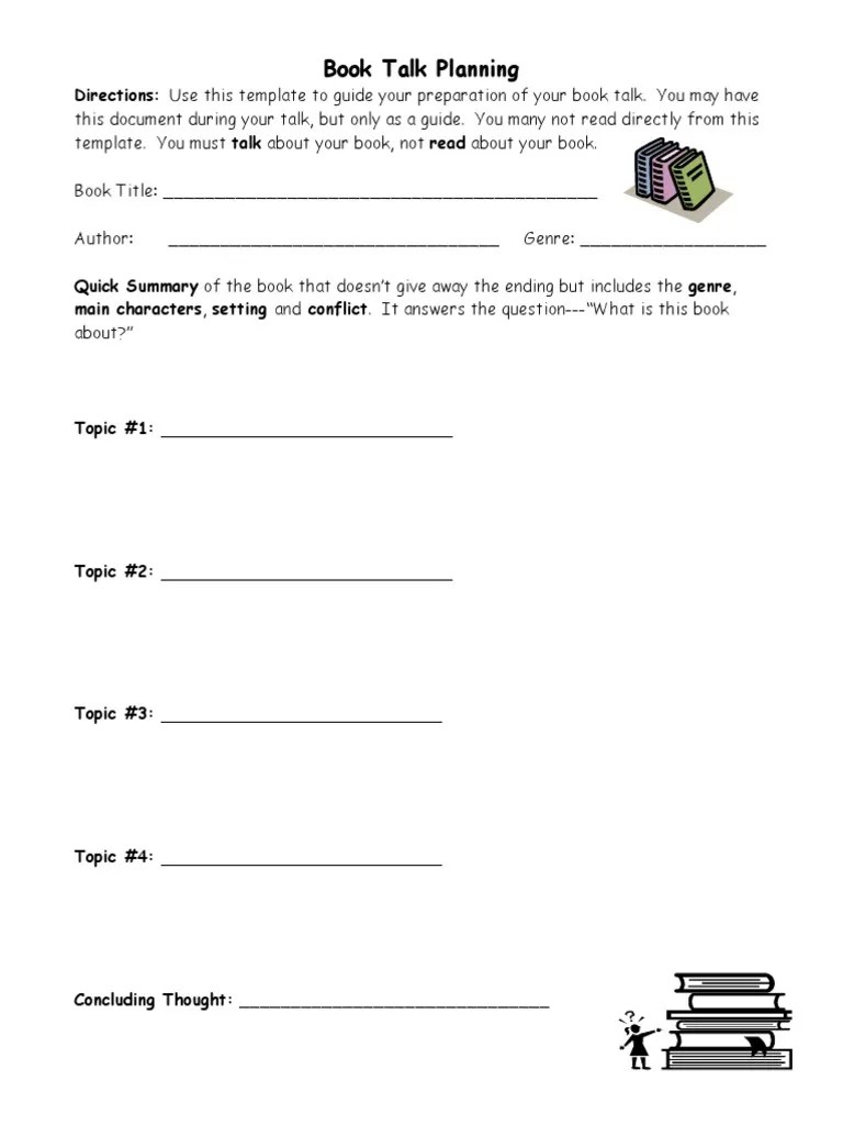 Book Talk Template - Book talks are like a little mini book commercial that your students give about a book they have read and it is a great way to motivate, inspire, and encourage a love of reading in your students. Book talks are like a little mini book commercial that your students give about a book they have read and it is a great way to motivate, inspire, and encourage a love of reading in your students. Find templates and resources for your book discussion group, including book club meeting. You want to entice your classmates to read the book. Learn how to create and deliver effective booktalks to promote reading and engage your audience. Book talks are like advertisements for a book. Thank you for signing up to receive the free book talk templates and the weekly reading roundup. Everything you need — including rubrics, audience feedback sheets, a reading survey, and template for student talks. Perfect for book club activities or independent reading challenges.