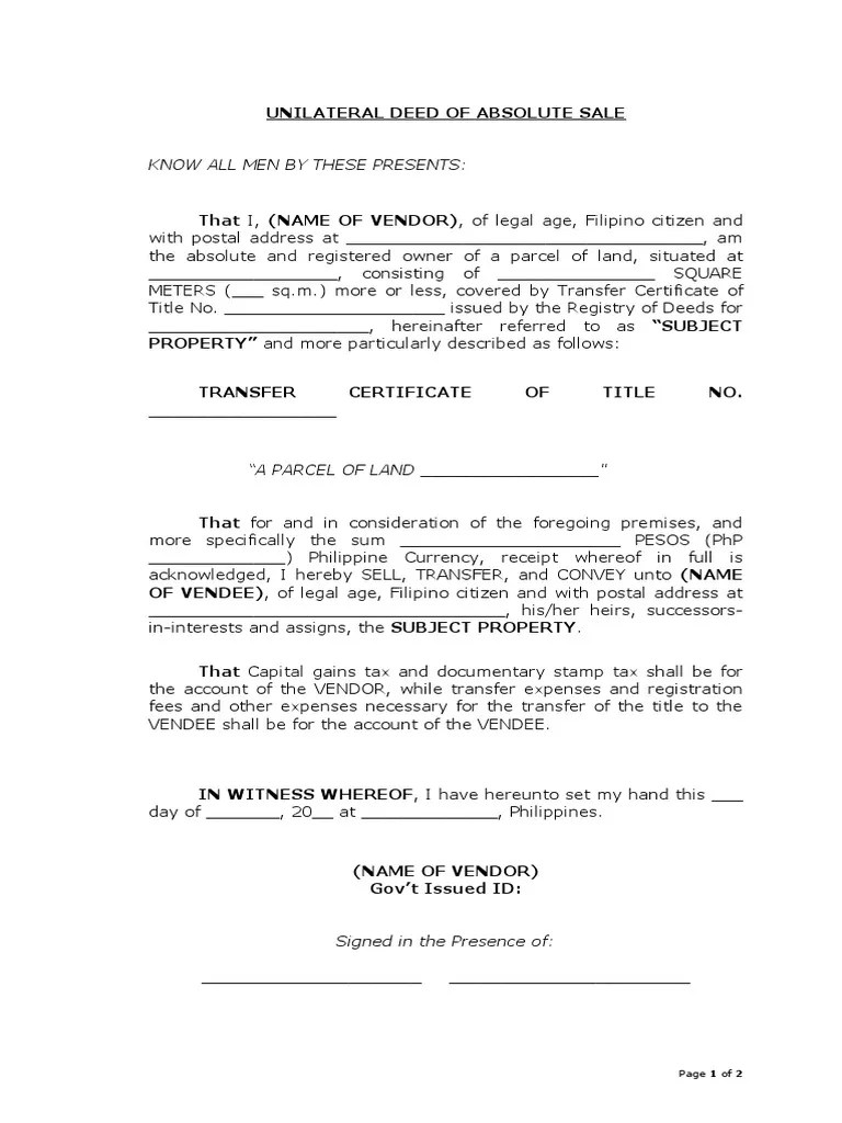 Unilateral Deed of Absolute Sale PDF Deed Justice