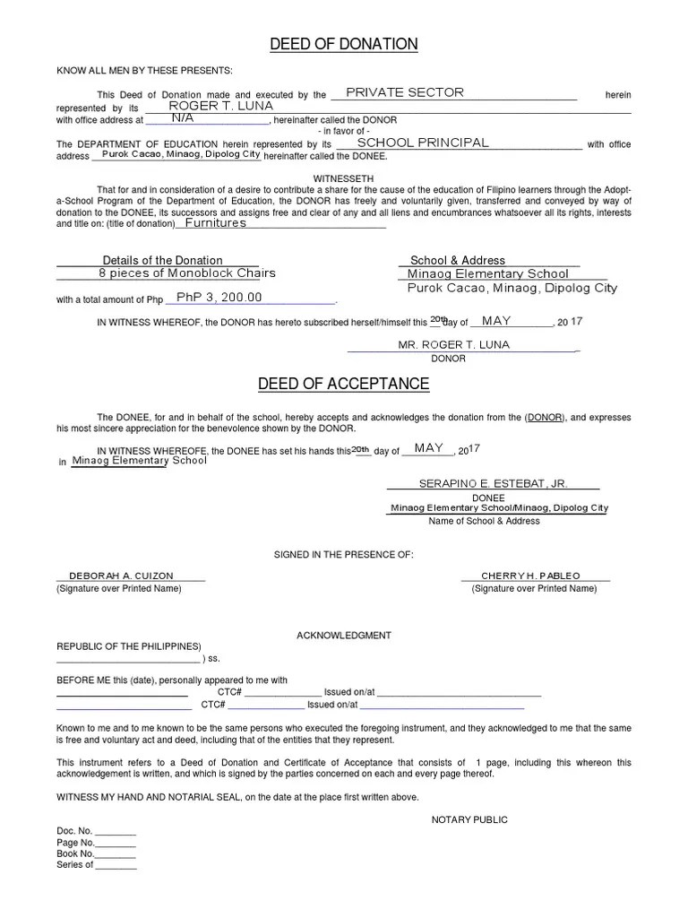 To dagupan city national high. Download or preview a deed of donation template in word and pdf formats. A deed by donation transfers the ownership of the characteristic or object to one, generally because of donor's magnanimity, generosity, kindness or. Customize and download this deed of donation design. No need to install software, just go to dochub, and sign up.