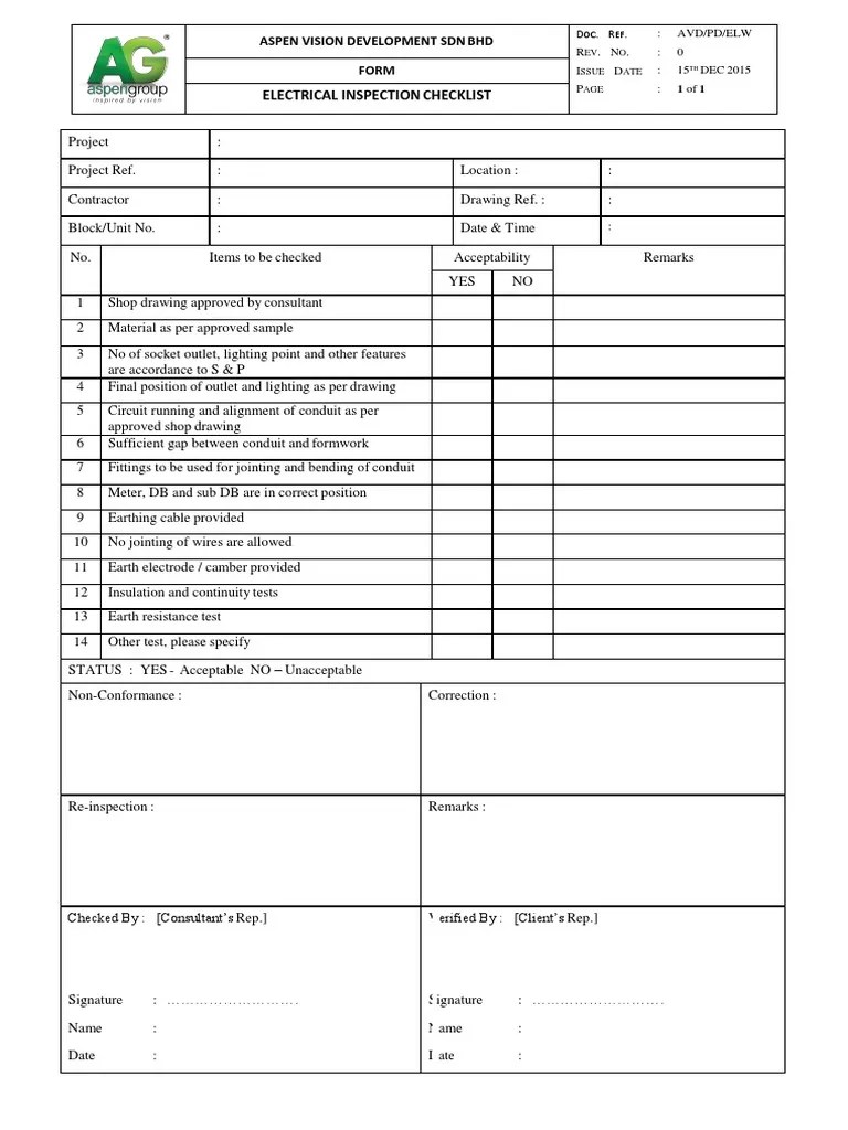 Electrical Inspection Checklist Aspen Vision Development SDN BHD Form PDF Wire Electricity