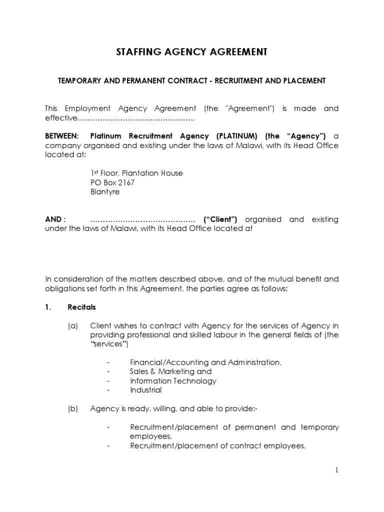 Staffing Agency Agreement Temporary And Permanent Contract Recruitment And Placement