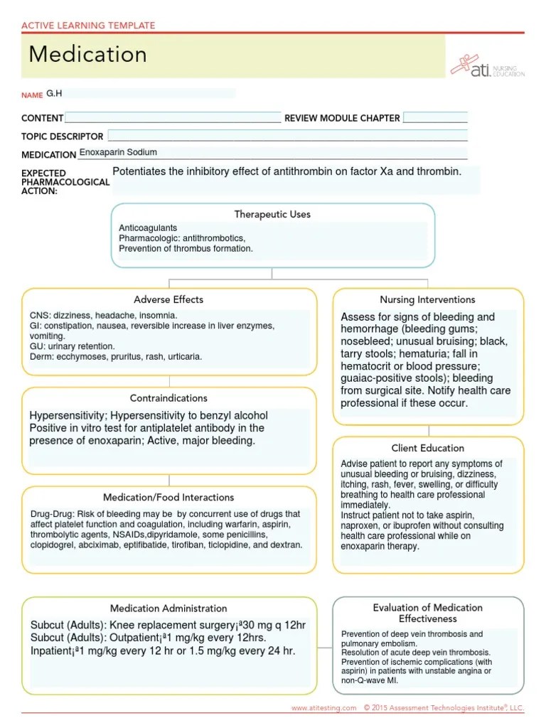 Enoxaparin ATI active learning template ACTIVE LEARNING TEMPLATE Medication STUDENT NAME
