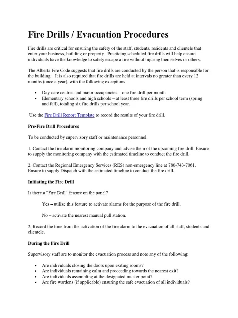 Practicing fire drills will help ensure individuals have the knowledge to safety escape a fire. Customize and download this fire drill procedure. Use an evacuation plan template or fire drill checklist to make planning your response and maintaining your fire drill log easier and faster. Download and print fire drill forms, reports, plans, and checklists for free. It provides a.