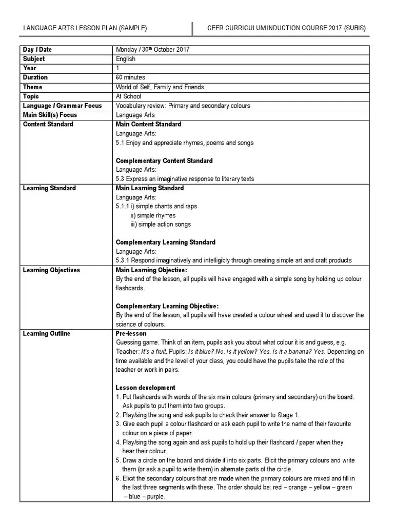 Language Arts Lesson Plan Color Curriculum