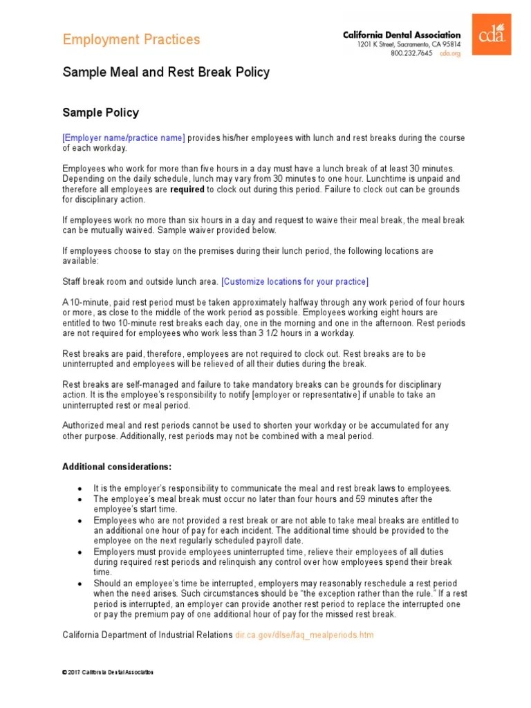 Many employers are required to provide a meal break for their employees. An example policy providing two rest breaks and one mandatory lunch break during the workday. This document outlines [your company name]'s policy on lunch breaks for all employees. Your first meal break should be taken no later than the end of your 5th hour of work. The policy.