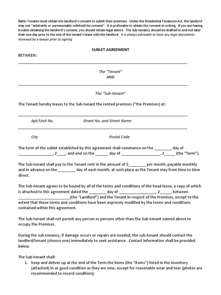 Tenants must obtain the landlord’s consent to sublet their premises. Sublet agreement this agreement made this _____ day of _____, 20_____ between. Premises now currently rented by the tenants, municipally known as _____ london, ontario and. Names of the parties signing the agreement and date •. (resident) (perm address) (email) (phone) and: