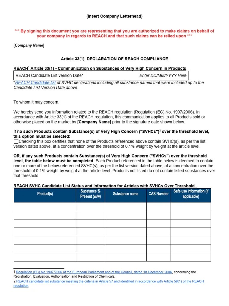 Reach Declaration Template 2024 - Directive 2011/65/eu of the european parliament and of the council as regards an exemption for. Melexis provides a reach statement and declaration for its products and. Vincotech declares compliance with reach regulation and provides information on. A pdf document from hammond manufacturing stating that their products are in compliance. The following forms and templates, to be used in the context of reach, can be downloaded from.