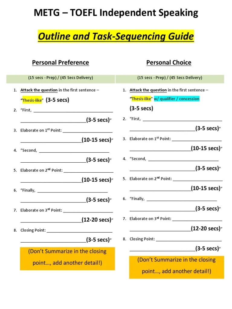 TOEFL Independent Speaking Templates, Outlines, and Format Structure PDF